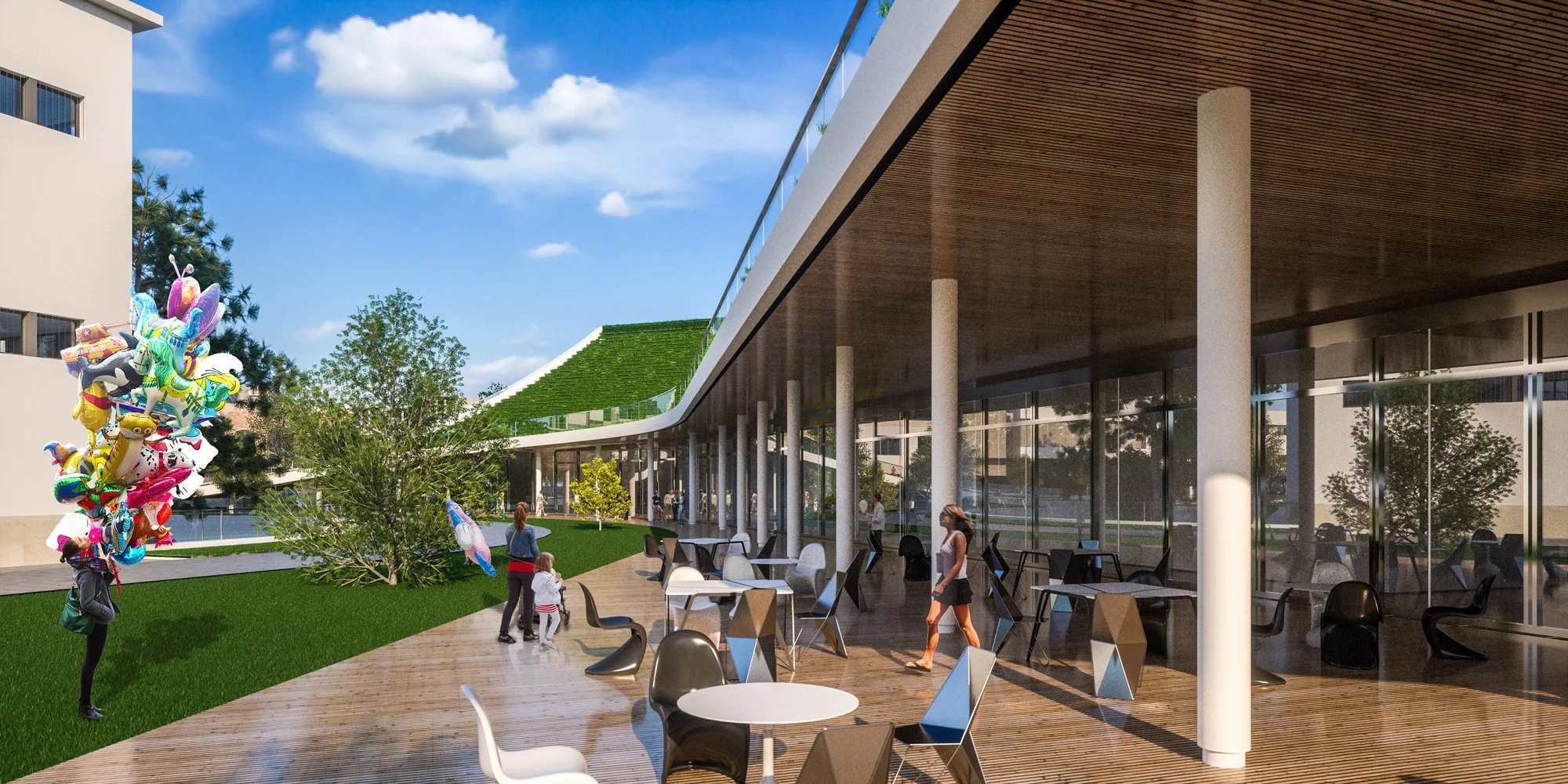 Structurally, the building is organized through a 6-meter grid of reinforced concrete columns and slabs, ensuring flexibility and durability. The pavilion’s roof is conceived as a hybrid structural landscape — a lightweight steel framework supporting pedestrian circulation and a vegetated surface that provides natural insulation and contributes to the building’s bioclimatic performance.