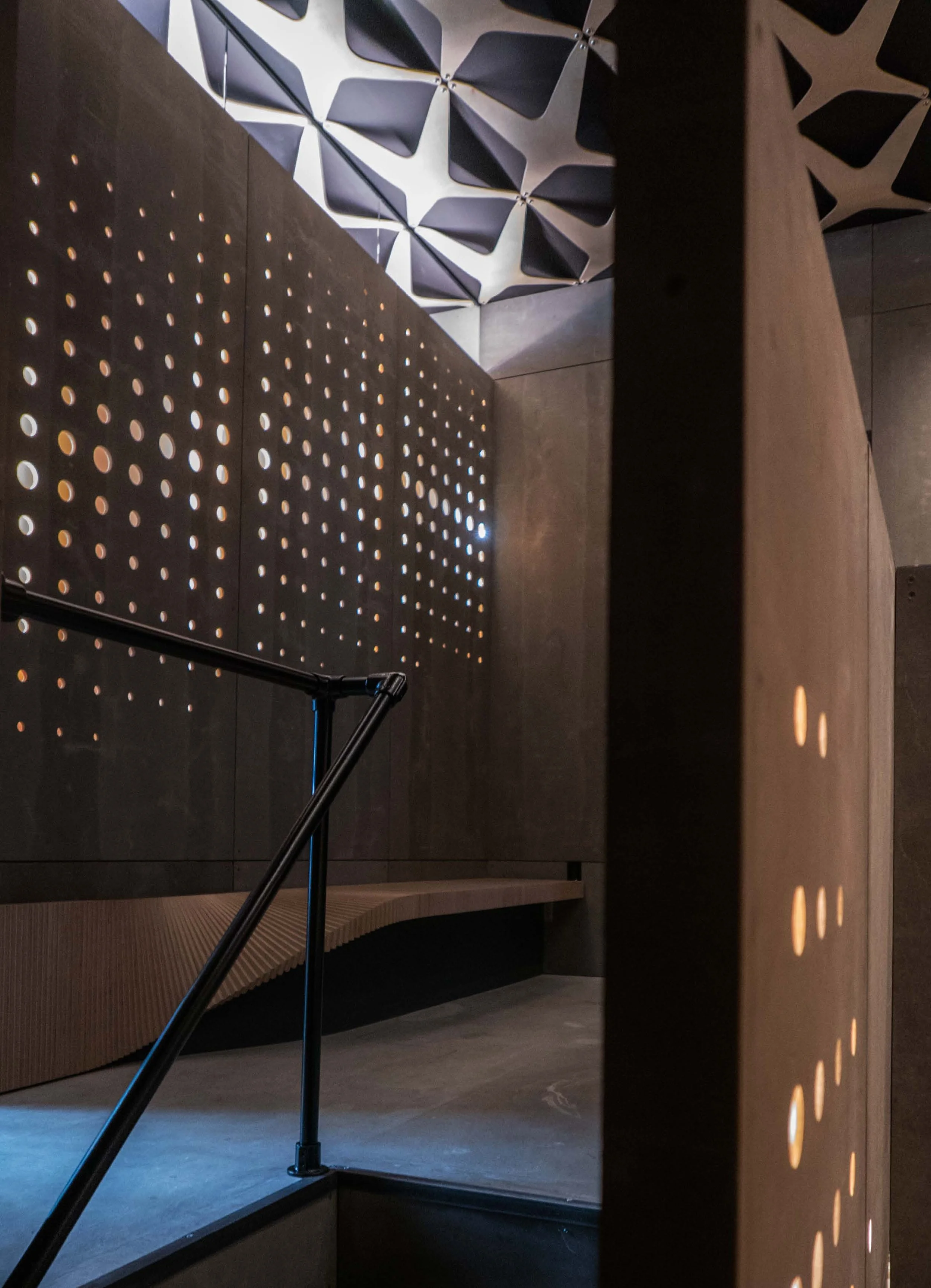 Sustainability plays a key role in the project. The interiors are wrapped with wood fiber–cement panels, while all wood elements are sourced from responsibly managed forests, underscoring a commitment to environmental and social responsibility.