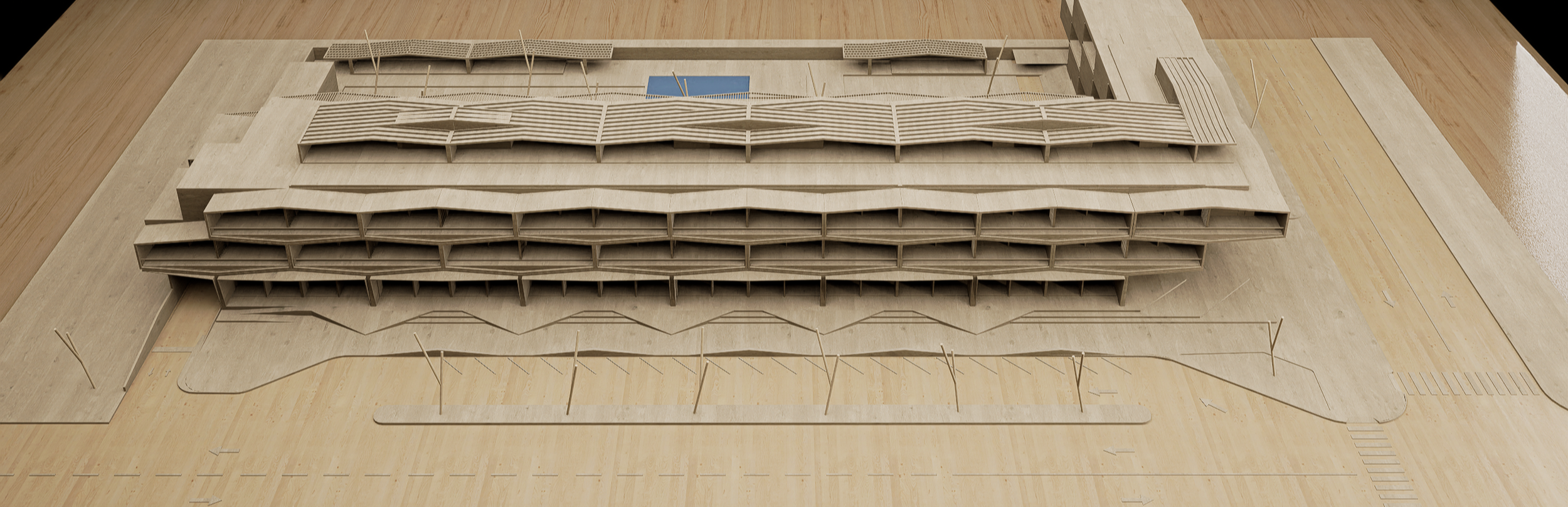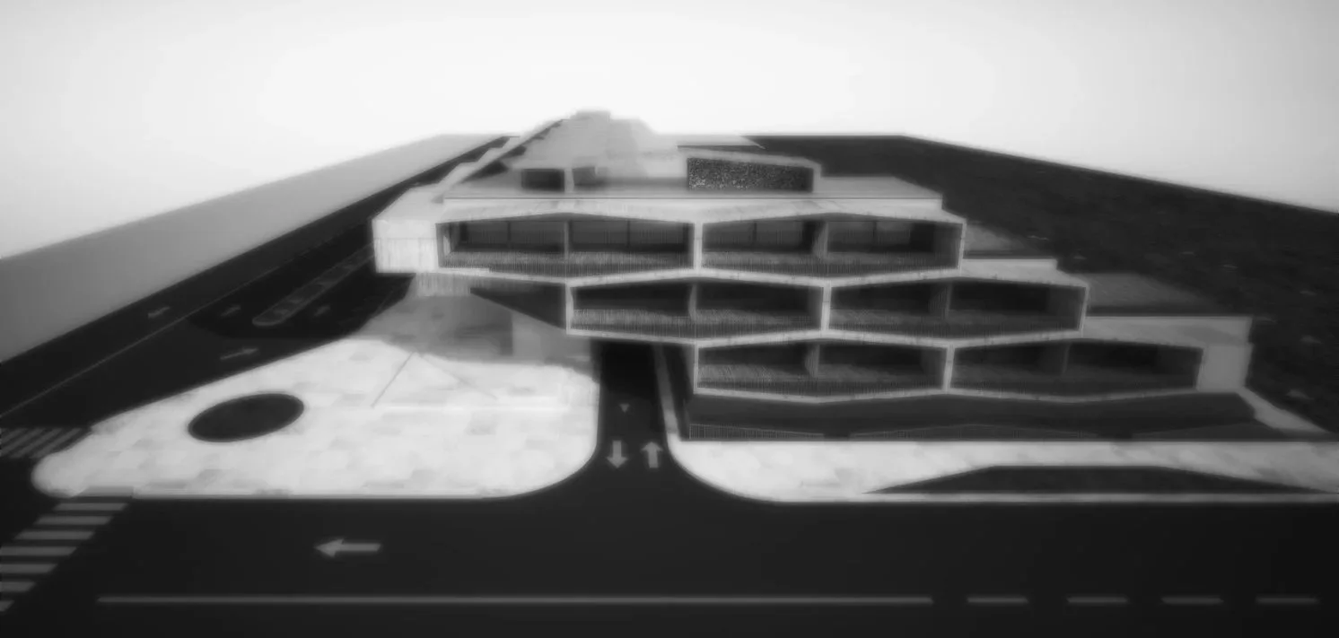 Organized around an efficient hexagonal grid, the complex maximizes volumetric potential with a minimal number of elements. Each module contains a polygonal living space and an irrigable garden cavity that mediates between the dwelling and the street. When aggregated, these gardens form a green infrastructure that not only enhances microclimate and biodiversity but also operates structurally as a truss system, distributing loads through interdependent units. Structure, landscape, and architecture coalesce into a unified organism.