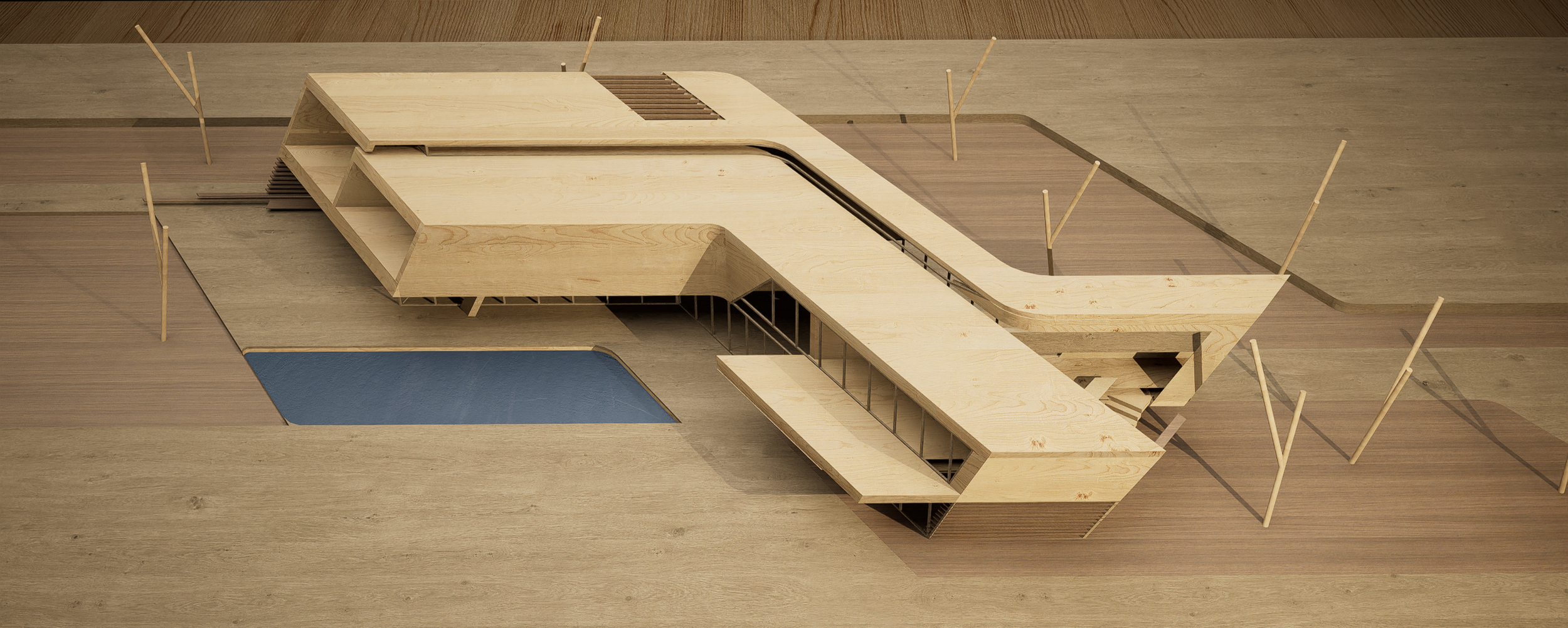 A continuous envelope defines the building’s presence: a folded shell that anchors itself to the earth while opening to the horizon through deep incisions and glazed apertures. The gesture is at once protective and receptive — a vessel that captures light and movement within a precise geometry.